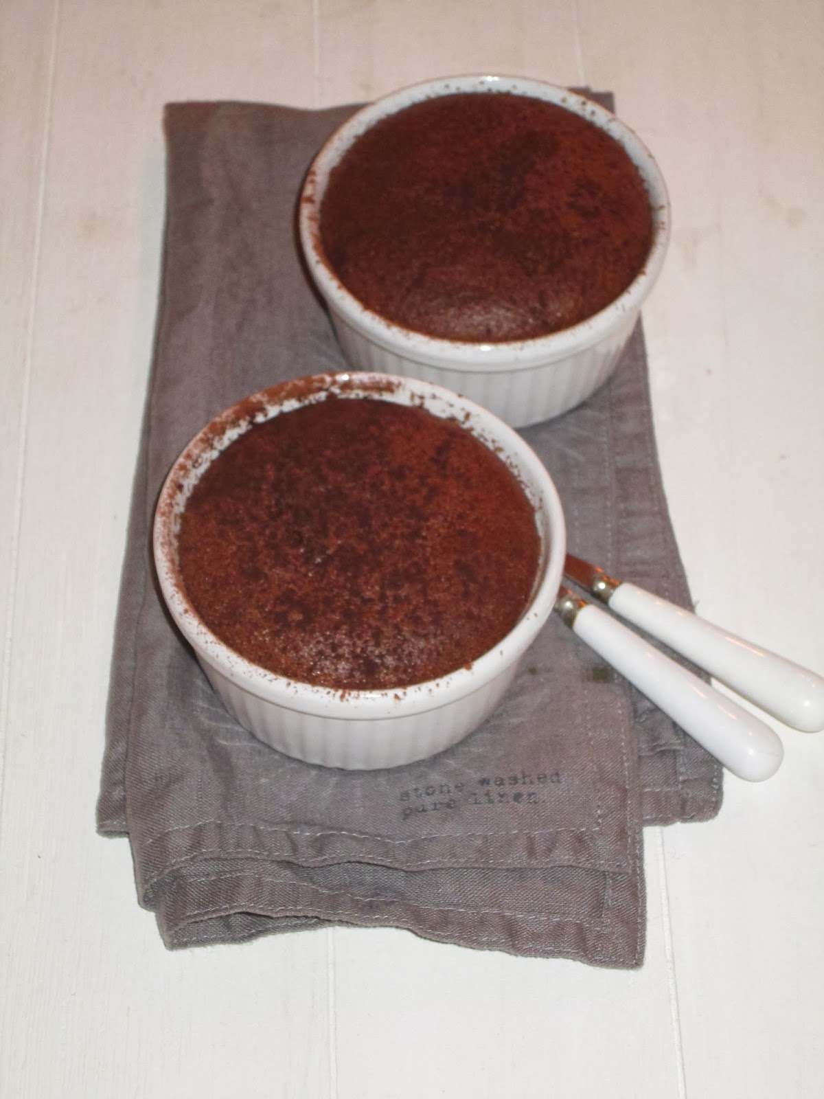 Verwarm de oven voor op 160 graden. Hak de chocolade in grove stukken en smelt samen met de boter au bain marie. Scheid de eieren van dooier en wit. Klop de dooiers samen met de suiker lekker romig. Roer de gesmolten chocolade/boter door het eimengsel. Zet even aan de kant. Mix de eiwitten luchtig. Schep door elkaar. Vet 4 ovenschaaltjes in. Verdeel de mousse over de schaaltjes en zet in de oven voor 20 minuten. Bestrooi de mousse met wat cacao en serveer ze lauwwarm.