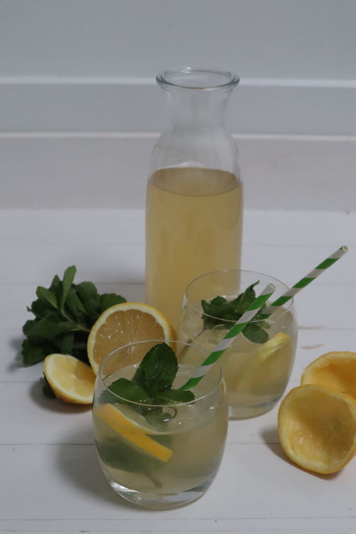 1 liter kokend water, ½ citroen, 1-2 zakjes groene of witte thee, verse munt, imkerhoning (of een ander zoetmiddel) naar smaak