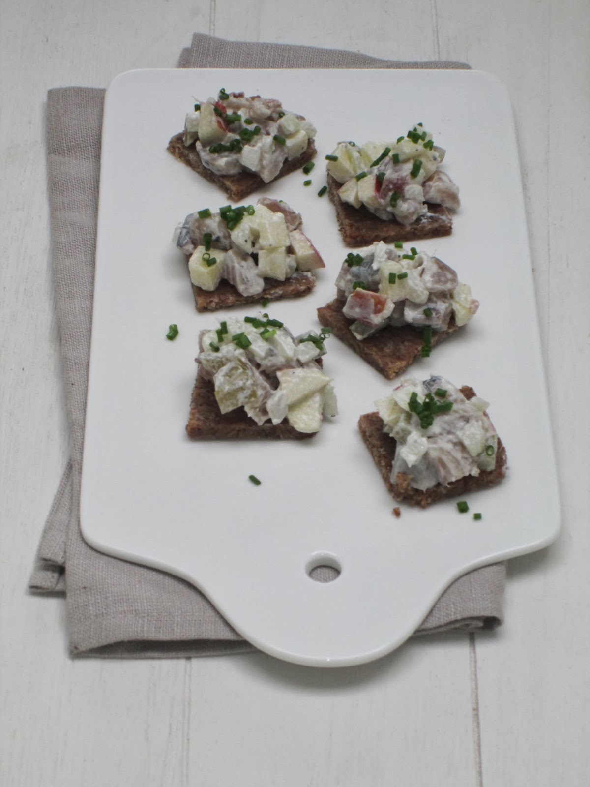 2 haringen, 1/2 appel, 1/2 ui of sjalot, 2 augurken (natuurwinkel), paar sprietjes bieslook, 1 eetlepel creme fraiche, zout en peper, roggebrood (natuurwinkel)