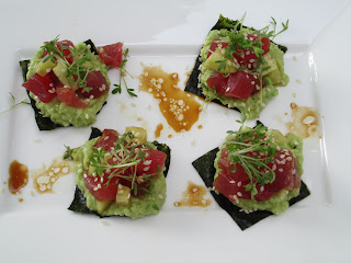 Het derde gerechtje in het Sushi-menu is een avocadocreme op nori met tonijntartaar. Het gerecht stond in het nieuwe nummer van Delicious, maar ik heb het recept wat aangepast.