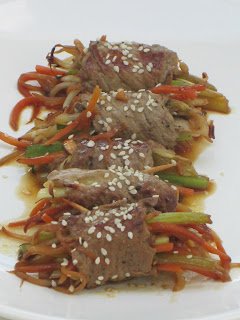 Neem de dunne plakjes biefstuk en leg hierop een beetje van de groenten. Rol de biefstukplak op en zet vast met een cocktailprikkertje. Verwarm opnieuw een pan op het vuur en smelt hierin wat roomboter. Bak de rolletjes aan één kant mooi bruin en draai ze om. Voeg de saus toe en verwarm nog 1 a 2 minuten. Serveer het vlees met de saus en bestrooi met de sesamzaadjes.