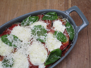**In een echte parmigiana gebruik je 2 bollen mozzarella. 1 tussen de lagen aubergine en 1 voor bovenop. Ik ben niet heel dol op mozzarella, alleen als hij bovenop een ovenschotel wordt gebruikt, dan komt er een lekkere knapperige korst op, tussen de lagen blijft hij zo taai, daar houd ik niet van, dus vandaar sla ik dit over ;-)
