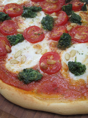 Mijn veruit meest favoriete pizza is belegd met: plakjes mozzarella, plukjes spinazie, gehalveerde cherrytomaatjes en bestrooid met pijnboompitjes. Als hij helemaal belegd is giet ik er nog wat olijfolie overheen en wat zwarte peper. Mmmm!!