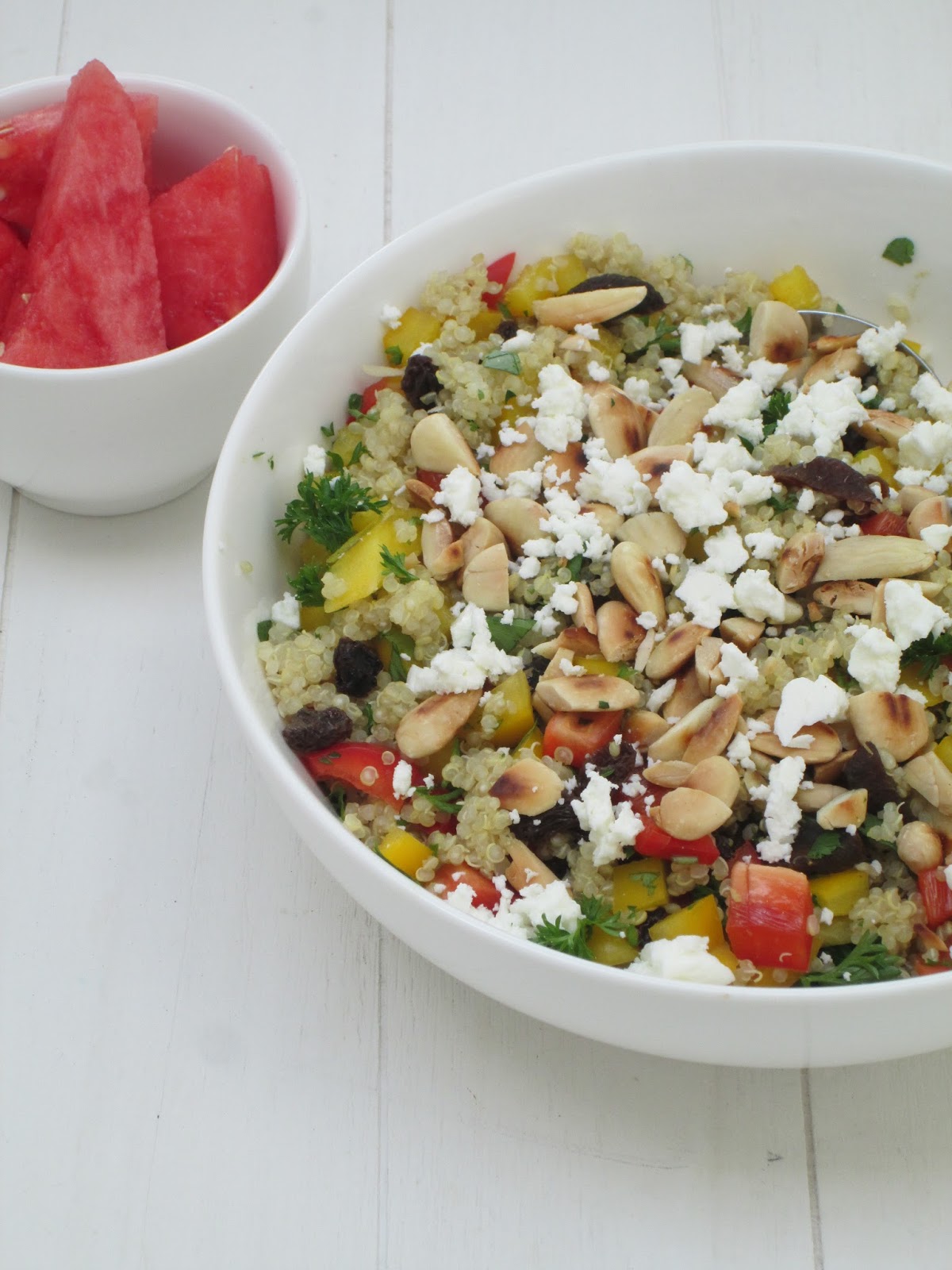 1 kop gekookte quinoa, 1 handje peterselie, 1 handje koriander, 100 gram ongezwavelde abrikozen, 1 gele paprika, 1 rode paprika, hand vol amandelen, handje rozijnen, sap van een halve citroen, zout en peper, feta naar smaak.