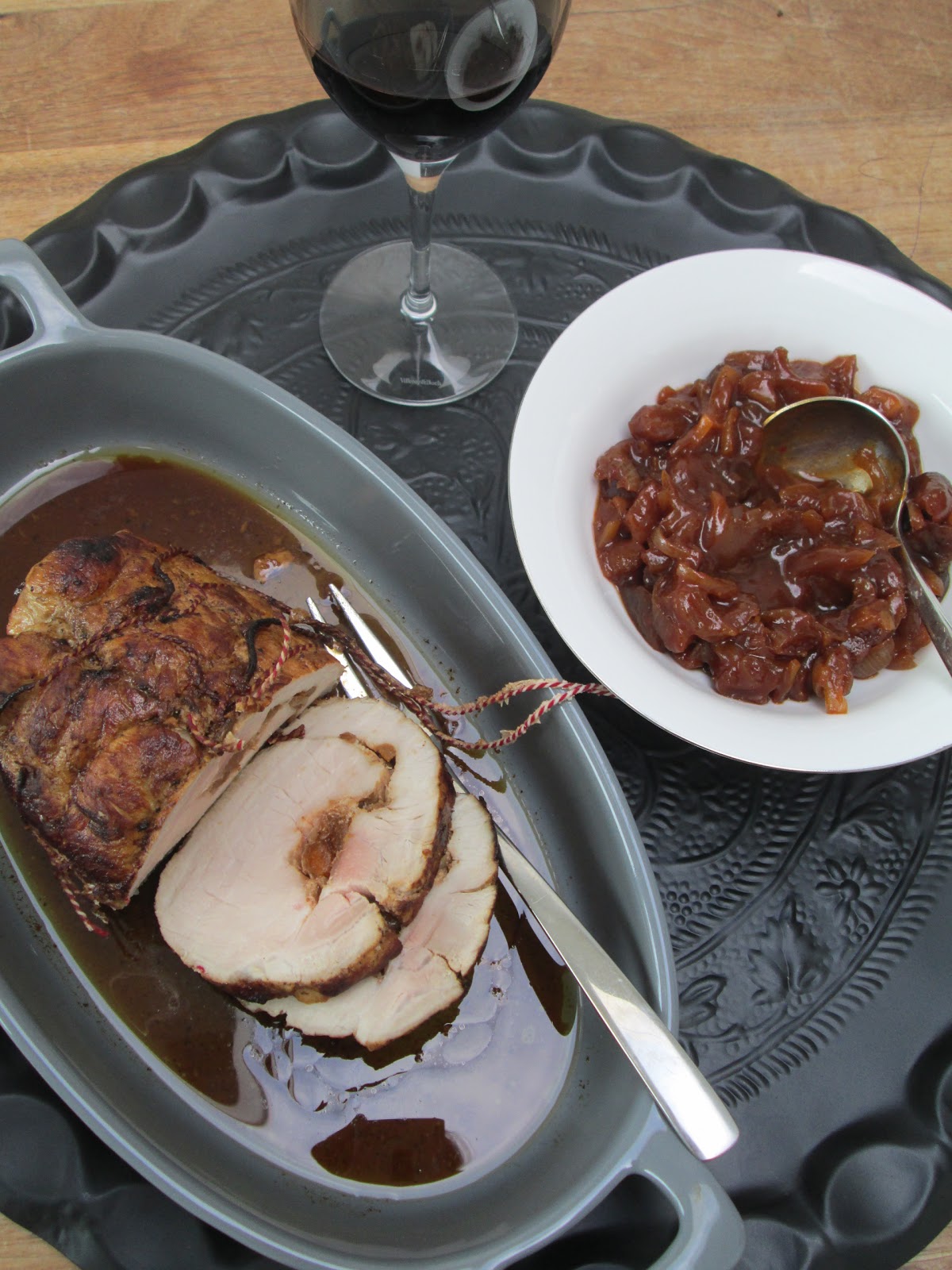 Voeg het weekvocht van de abrikozen toe aan het overgebleven ui/abrikozenmengsel en breng dit aan de kook. Serveer deze saus bij de rollade.