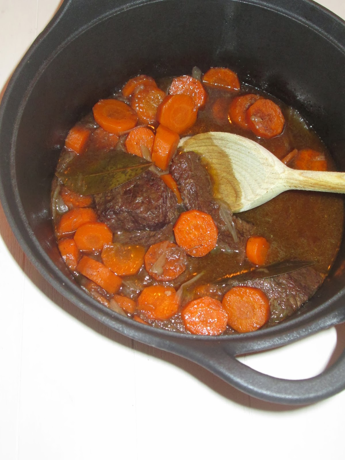 3 á 4 (biologische) runderlappen (bijv. klapstuk of ander stoofvlees), 5 uien, 3 winterwortels, 1 glas rode wijn, bouillon of heet water, 2 laurierblaadjes, 5 kruidnagels, zout en peper, roomboter, evt. 1 eetlepel speltmeel