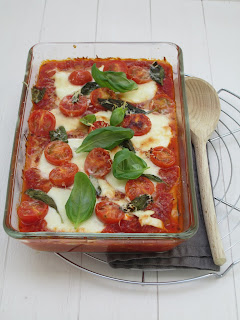 Verder: 1 courgette, 1 bol mozzarella, 125 gram cherrytomaatjes, blaadjes basilicum, geraspte kaas