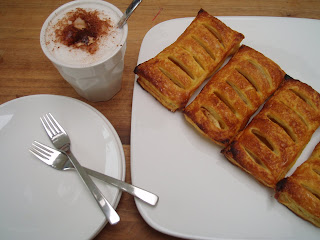 1 plakje diepvriesbladerdeeg (Koopmans, roomboterbladerdeeg), 1 kwartstukje appel geschild, wat kaneel en palm of kokosbloesemsuiker, 1 el melk.
