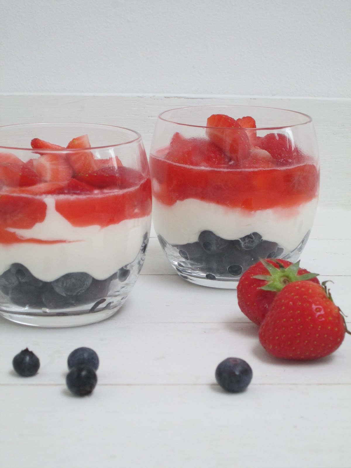 Was de bessen en verdeel ze onderin de glazen. Klop de slagroom met 1 á 2 eetlepels honing stijf. Meng met de yoghurt. Schep dit op de blauwe bessen. Snijd de aardbeien in vieren. Verwarm de helft van de aardbeien in een pannetje met 1 eetlepel water en een theelepeltje honing. Breng aan de kook en roer tot een sausje. Plet de aardbeien evt. wat met een vork. Laat de saus wat afkoelen en verdeel over de yoghurt. Garneer de glazen met de rest van de partjes aardbei.