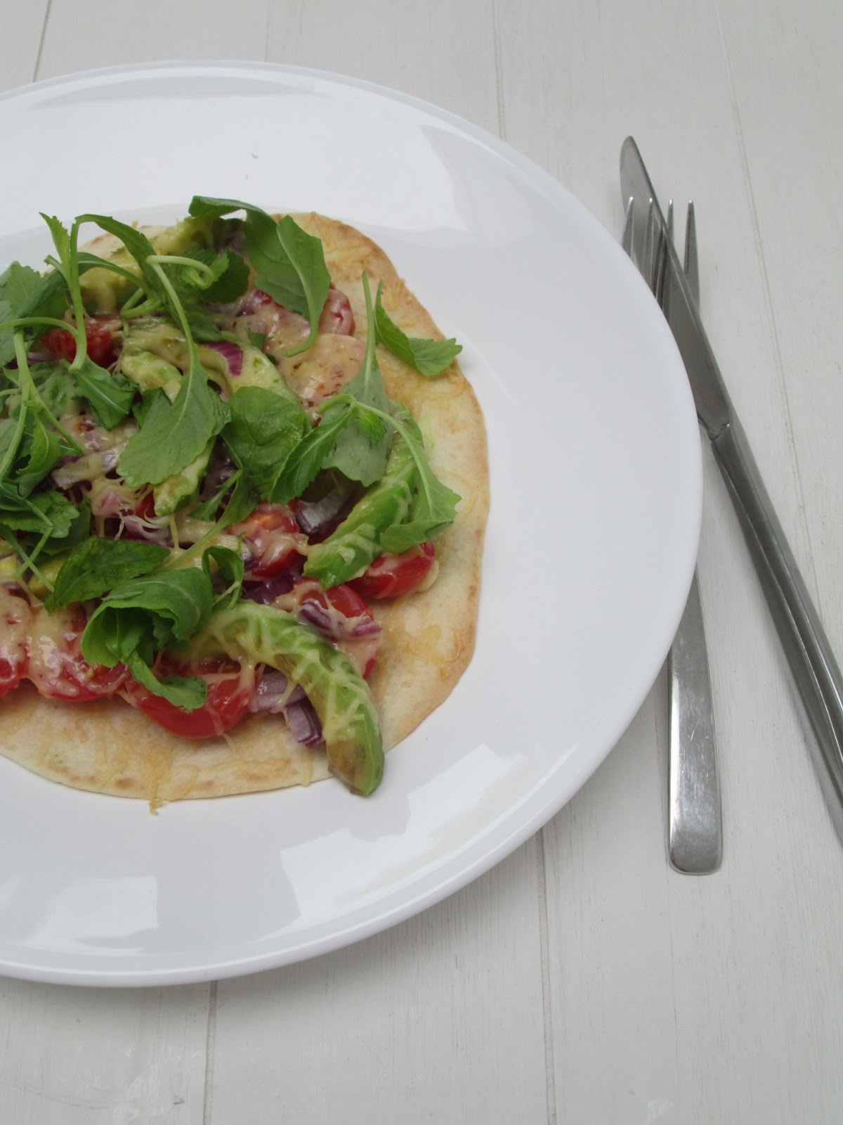 Smeer wat pesto op de wraps. Beleg de wraps met gehalveerde cherrytomaatjes, plakjes avocado en rode ui ringen. Bestrooi met geraspte kaas en schuif in een voorverwarmde oven. De wraps zijn klaar als de kaas is gesmolten. Bestrooi de wraps met pijnboompitjes en wat verse rucola!