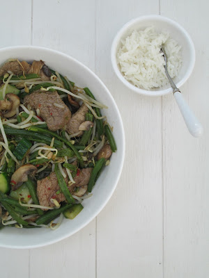 Kook de haricot verts in 5 minuten beetgaar en snijd de komkommer in grove stukjes. Verhit een wok op hoog vuur en doe wat (kokos)olie in de pan. Haal de biefstuk uit de marinade en bak even heel kort tot het bijna gaar is. Roerbak de groenten samen met de marinade tot ze beetgaar zijn en voeg op het laatste de biefstuk weer toe. Besprenkel evt. nog met wat limoensap.