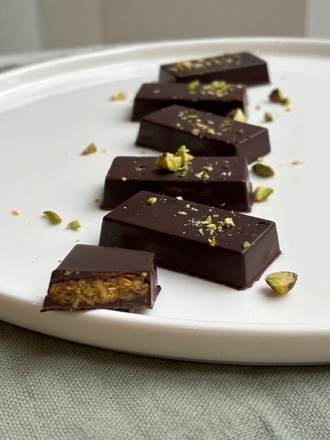 Een echte hype op social media is de Dubai chocolade. Een reep pure chocolade met daarin een vulling van pistache-pasta gemengd met Kadayif. Kadayif zijn knapperige, heel fijn gesneden reepjes filodeeg. Dit is echter niet glutenvrij en hier in de omgeving moeilijk verkrijgbaar en om het gezonder én glutenvrij te maken heb ik het vervangen door geroosterd amandelschaafsel. En dit heeft goed uitgepakt, een heerlijke reep chocolade met heerlijke pistachevulling.