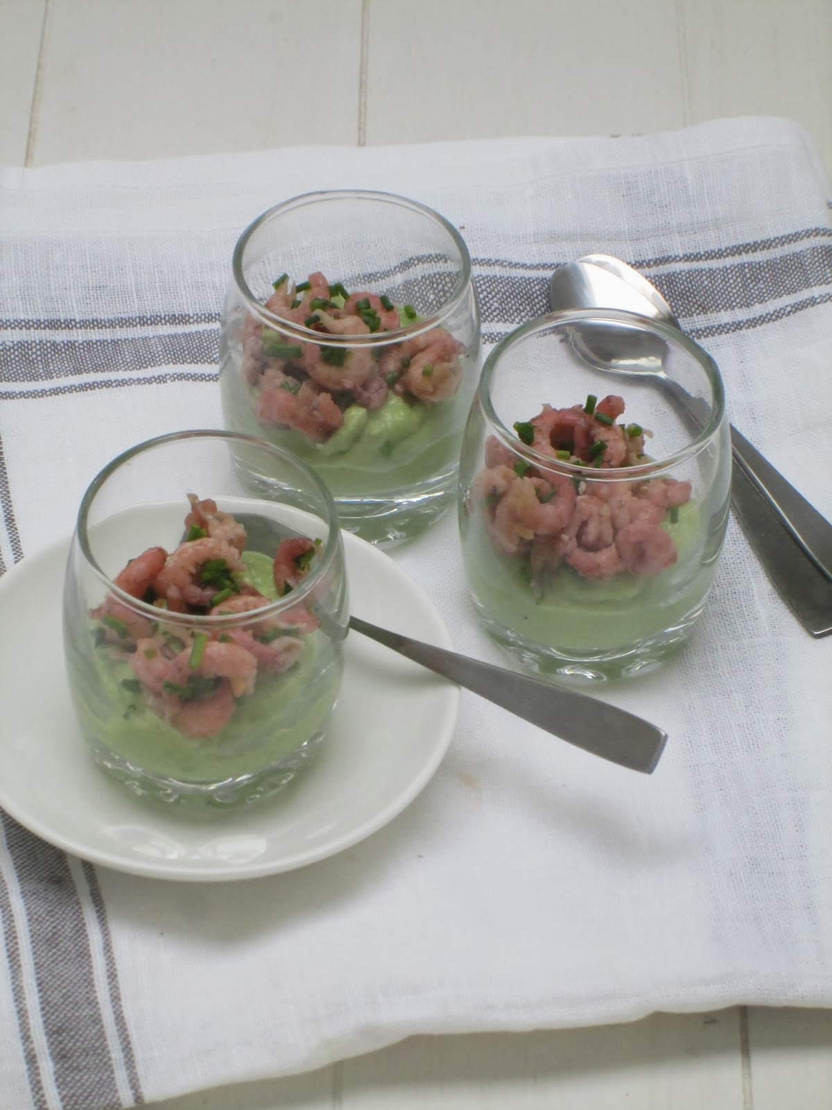 Haal het vruchtvlees uit de avocado en maal deze fijn in een keukenmachine of prak met een vork heel fijn. Meng met de mayonaise en maak op smaak met zout en peper. Snipper de bieslook fijn en meng met de garnaaltjes. Schep de avocadomousse in glaasjes (ongeveer 2 theelepeltjes per glaasje) en schep daar wat garnaaltjes (1 a 2 lepeltjes) bovenop. Maak het af met wat extra bieslook.